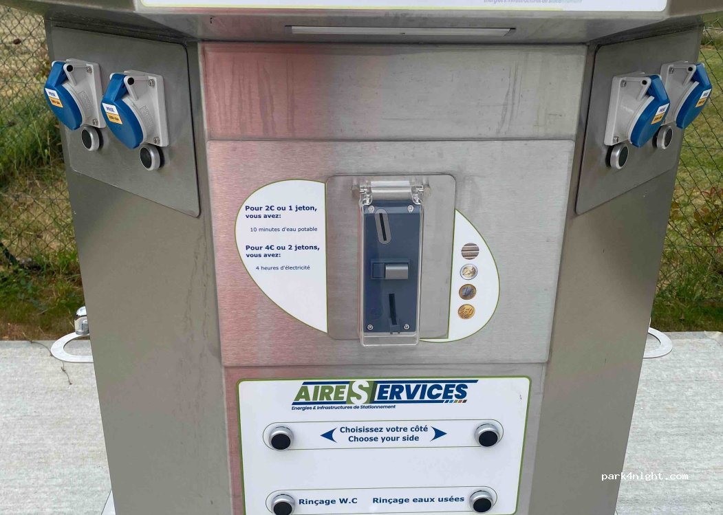 merci à la commune pour l'aire propre plat 4h pour 4 € d'électricité je trouve correct les jetons se trouvent à la boulangerie à 300 mètres à pied et en plus très bon pain très bon gâteau les gens autour sont très accueillants