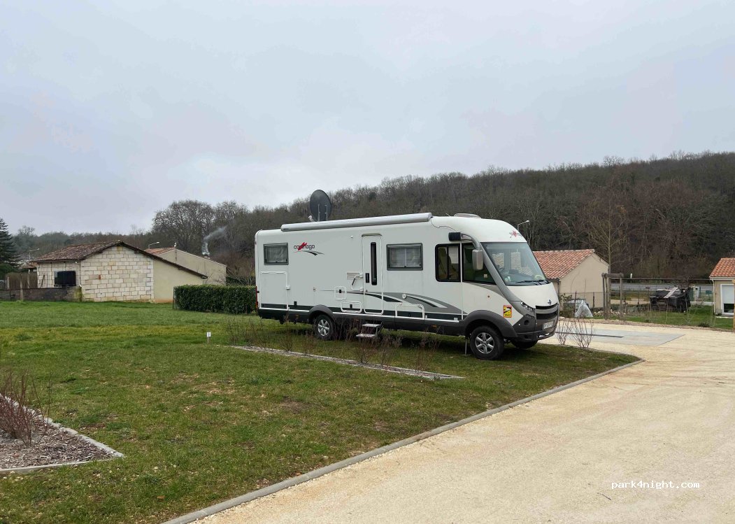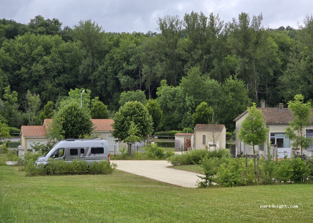L’entrée n’est pas très facile à repérer surtout si on arrive de Périgueux. On dirait qu’on rentre chez des particuliers, il y a deux poteaux à l’entrée avec marqué « groupe scolaire ». À part cette difficulté, l’aire est très bien, merci à la commune de nous accueillir.