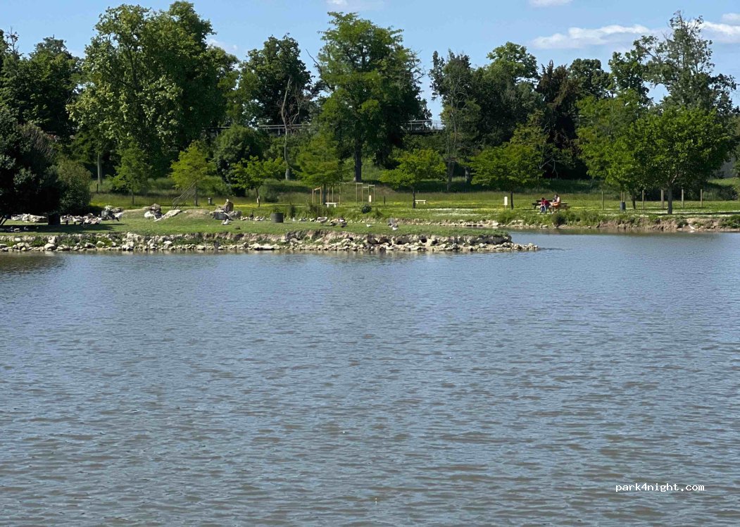 Park mit einem großen See und Enten neben der Straße, ein schöner Zwischenstopp zum Essen und Verbringen des Tages ... Ich weiß es nicht, nachts fahren sicher Autos vorbei
