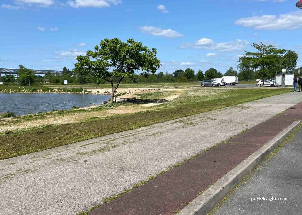 Parc avec un grand lac et des canards au bord de la route, une belle halte pour manger et passer la journée... Je ne sais pas la nuit mais sûrement des voitures passent.