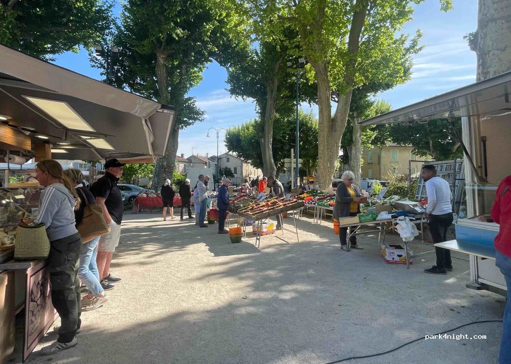 Nous y étions, parking agréable à l’ombre à certain endroit, et nous y avons visité le village qui est très jolie, avec un marché avec des produits frais, endroit convivial, les m2m