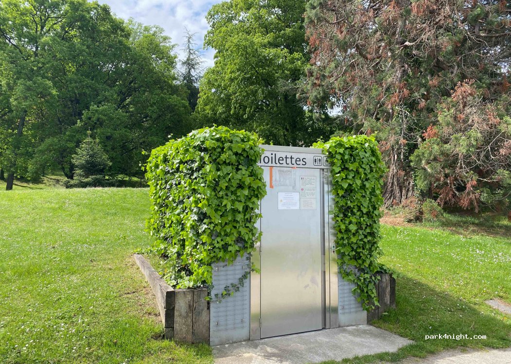 Toilettes publiques dans un parc très bien entretenu, nombreux bancs face au lac (mais route bruyante entre les deux). Bon spot pour une courte halte