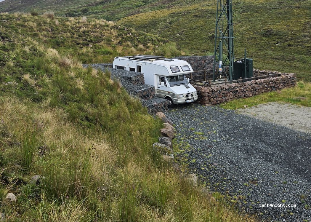 Nice location. Please keep clean as seems to be new and spotless. Hardly any reception (Same as spot up the road by next transmitter) this one is next to transmitter, too. Humm all the time didn't bother us. Goodnight sleep hardly any traffic. Nice little walk up track on right, not far up road to gorgeous loch and views.