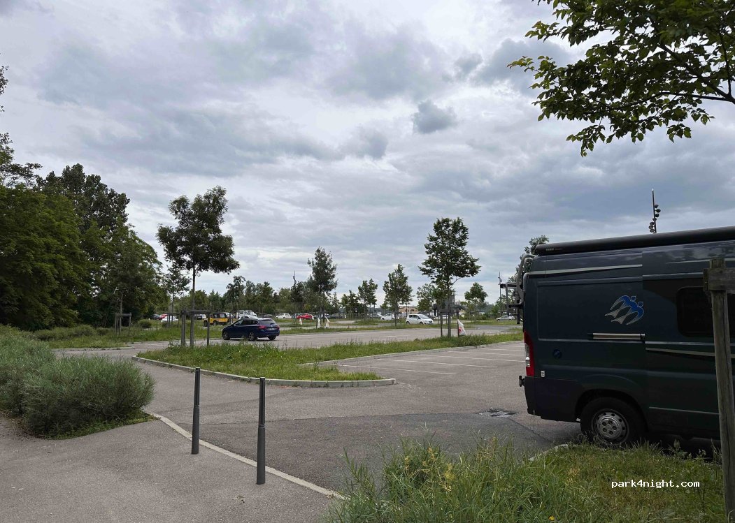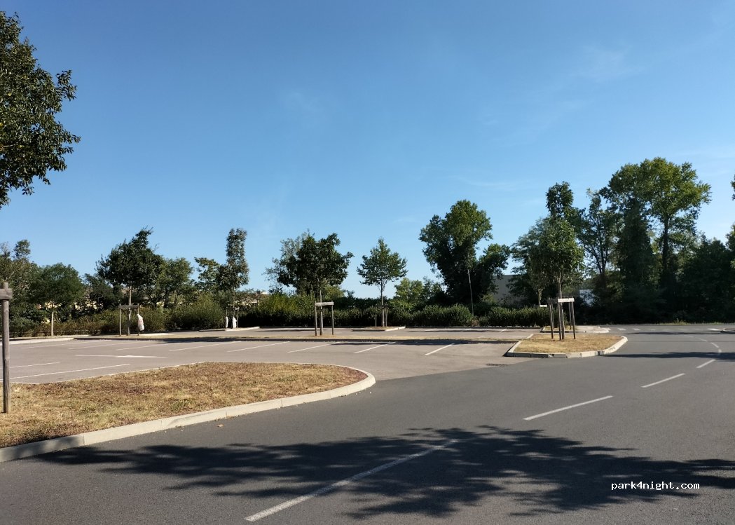 Chouette parking à partager avec les voitures, beaucoup de places à cette période. Le terrain est plat et asphalté. Malheureusement c’est un lieu où les noctambules se rassemblent et parle assez fort durant toute la nuit, ce qui perturbe le sommeil. À la sortie de Lyon, c’est tout de même pratique pour une pause.