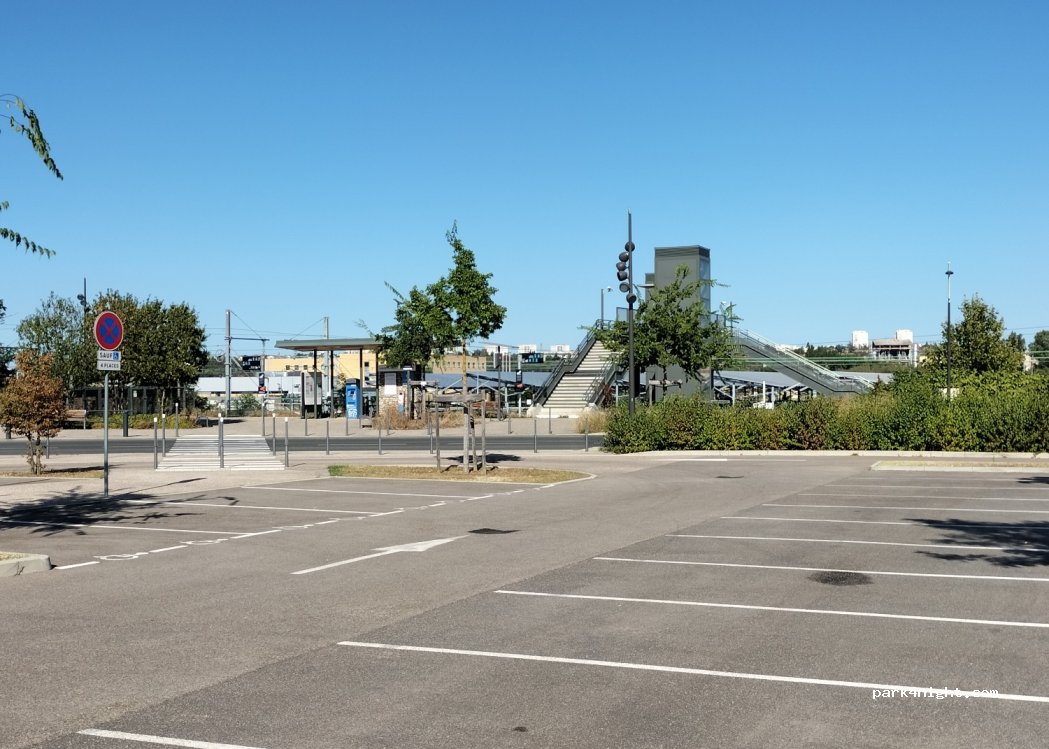 Parcheggio ampio, ben illuminato. No servizi, tranquillo. Supermercato a 100 mt. Attaccato al parcheggio c'è una piccola stazione con treno per Lione ogni 30 minuti, il viaggio dura 10 minuti. In alternativa passa di lì anche il bus. Comodissimo! Non spaventatevi se alla sera arriva qualche ragazzino a fare un giro, nessuno ci ha disturbato la notte.