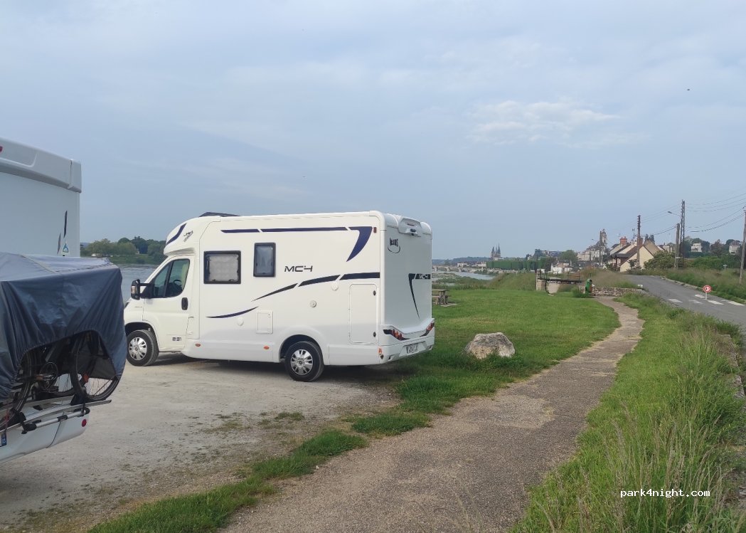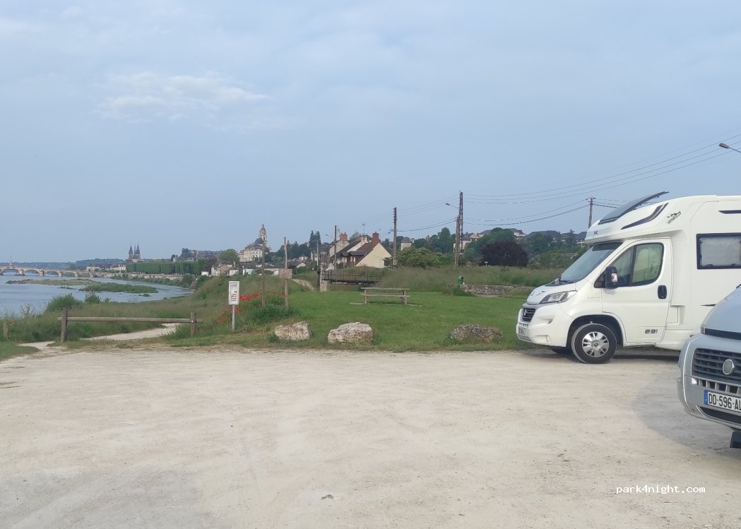 A 2 km du centre de Blois, en bord de Loire, petit emplacement gravillonné pour 3 ou 4 véhicules sans limite de hauteur. INTERDIT du 1er juin au 30 septembre. Plus ou moins niveau, nous avons passé une nuit très calme en compagnie de deux autres CC. environ 100 m avant il y a un autre espace similaire. aucun service. poubelle et table de pique-nique.