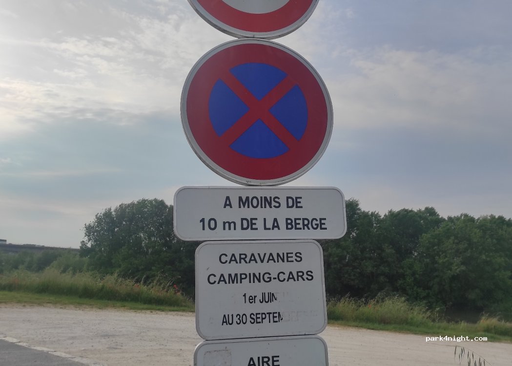 A 2 km del centro de Blois, a orillas del Loira, pequeño espacio de grava para 3 o 4 vehículos sin límite de altura. PROHIBIDO del 1 de junio al 30 de septiembre. Más o menos nivelados, pasamos una noche muy tranquila junto a otros dos CCs. unos 100 m antes hay otro espacio similar. sin servicios bote de basura y mesa de picnic.