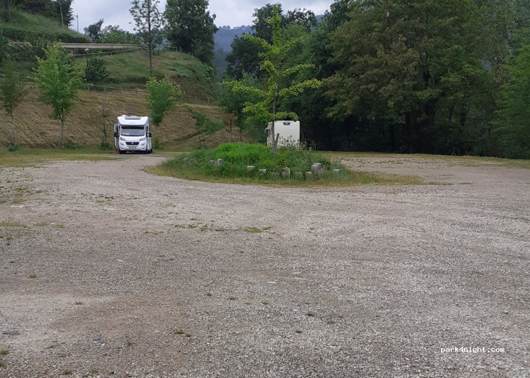 Lovely little town and spacious parking. You have to choose whether you would prefer to park nearer the road one one side or a fast flowing, somewhat noisy, river on the other. We chose the river side and slept, surprisingly, reasonably well even without closing the canvas roof on our van. It's a short walk into town via a small foot or cycle bridge which has toilets on both sides.