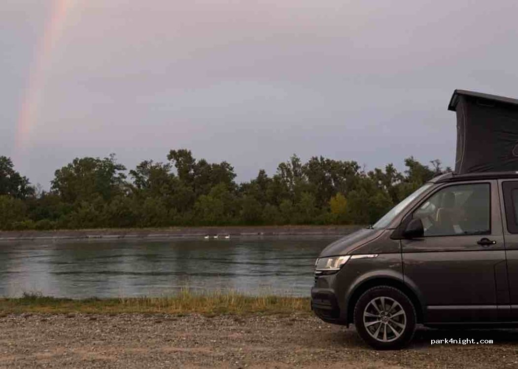 Possibilité de stationner au bord du Rhin. Coin isolé et assez tranquille. La route est proche pas dérangeante. Idéal pour une courte pose de 1 ou 2 nuits.