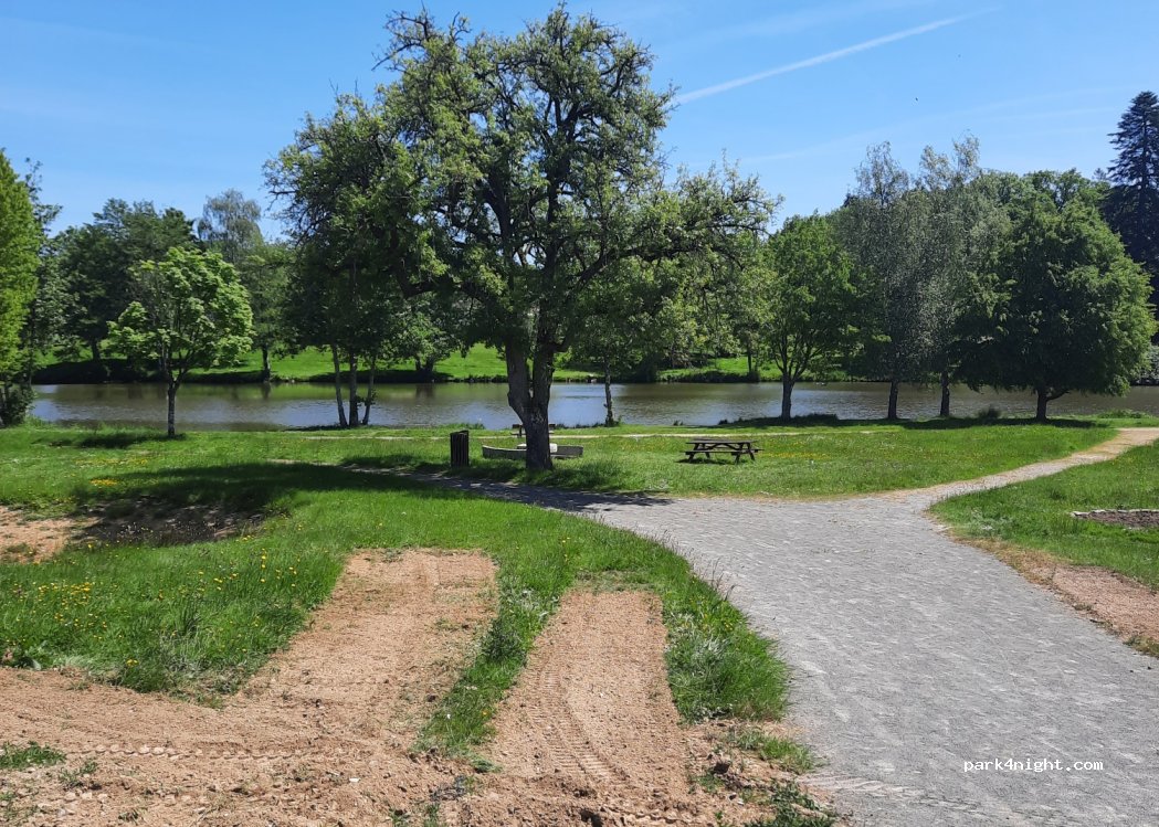 Nous y avons fait une halte pour déjeuner, l'endroit est calme. Il y a de nombreuses tables de pique nique (dont une couverte), une aire de jeux pour enfants, des WC et des conteneurs pour les déchets.La vue sur l'étang est sympa. Cependant, il n'y a pas de place adaptée aux camping car, uniquement des places de voitures standards.