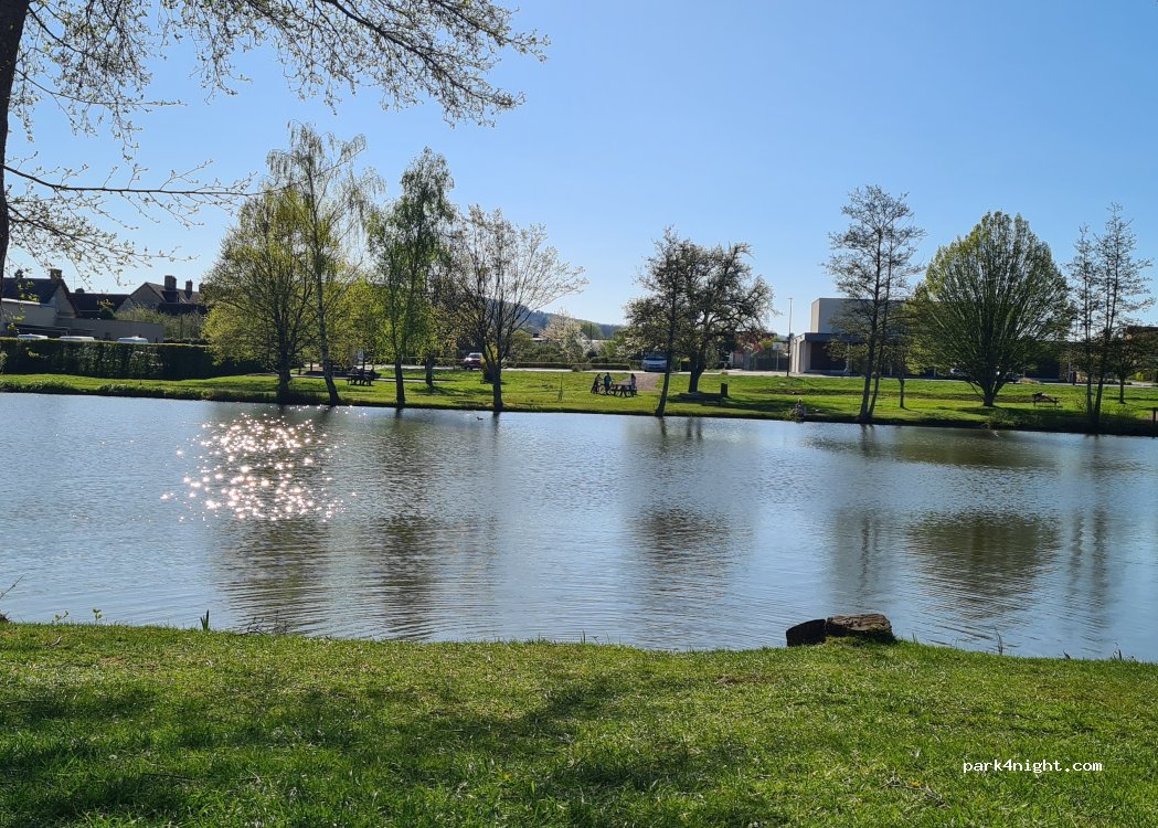 tout est dit plus bas : un peu à l'écart du bruit des camions, un joli plan d'eau, qqs tables de picnic, un WC automatique, on partage le parking avec les autos. une boulangerie a 4mn a pied (non testée). super étape d'une nuit !