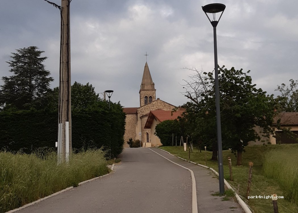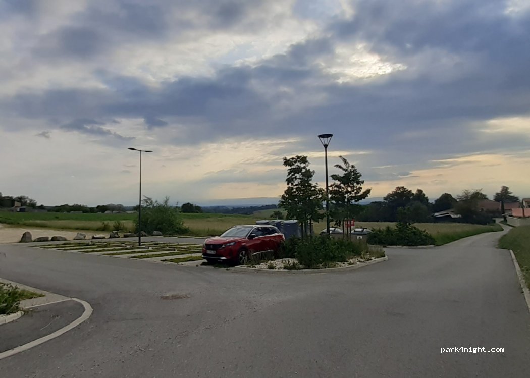 Parking de l'église un peu à l'écart. Légèrement en pente. Coin poubelles. Calme et jolie vue.