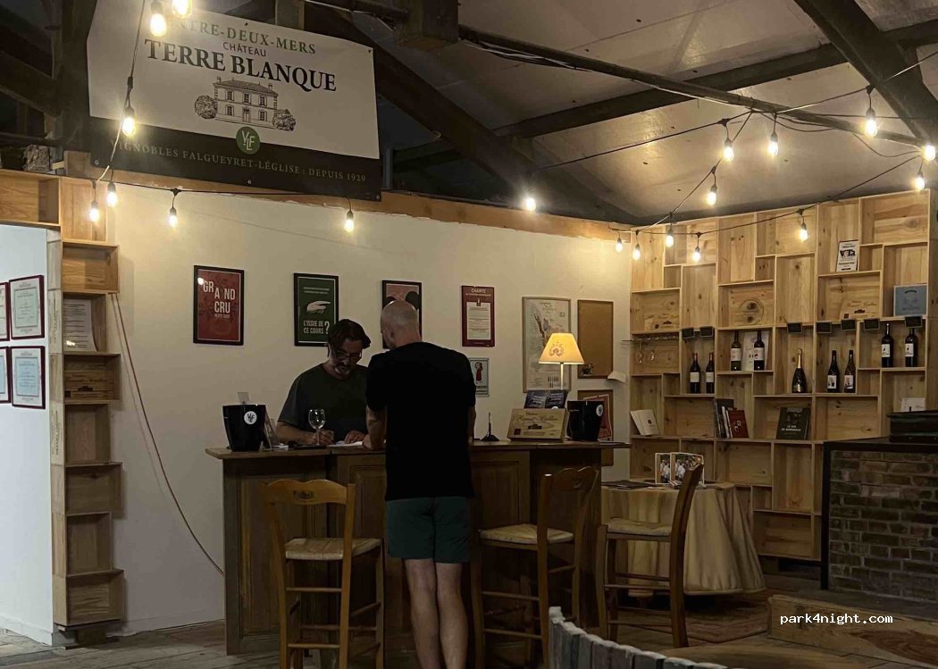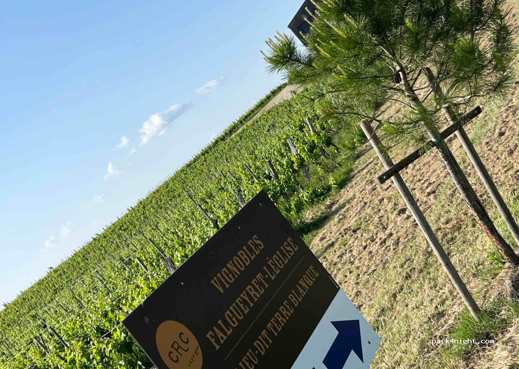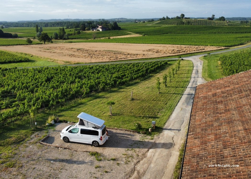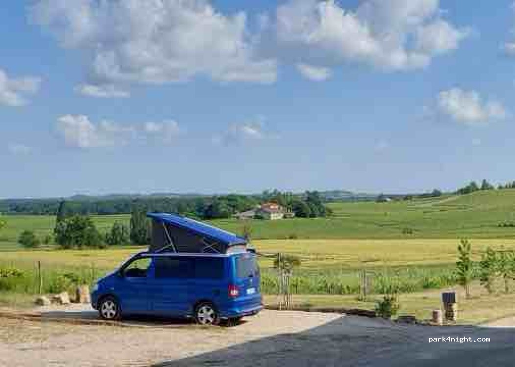 Deux aires de stationnement vous attendent, avec une superbe vue sur l'entre-deux-mers. Catherine et Sébastien vous accueillent sur leur propriété viticole, vous pourrez découvrir leurs vins. En visitant et dégustant leur production ils vous partageront leur amour pour cette région magnifique.