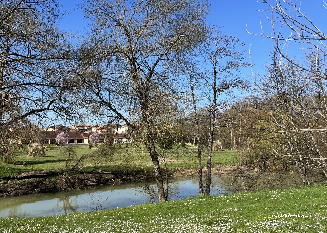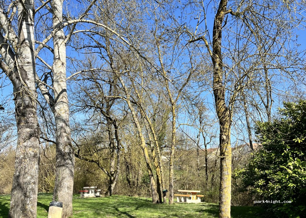 Bord de rivière , 3 tables pour manger , 5 places pour se garer. Bien pour une pause en journée. L’autre aire était fermé car inondée