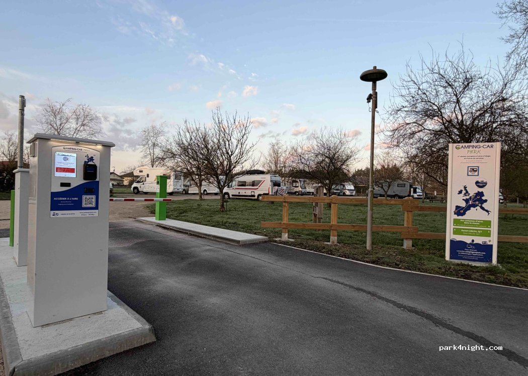 Belle aire effectivement mais le stationnement n’est pas gratuit : 4€ +0,80€ de taxe de séjour . Agréable en bord de Seille