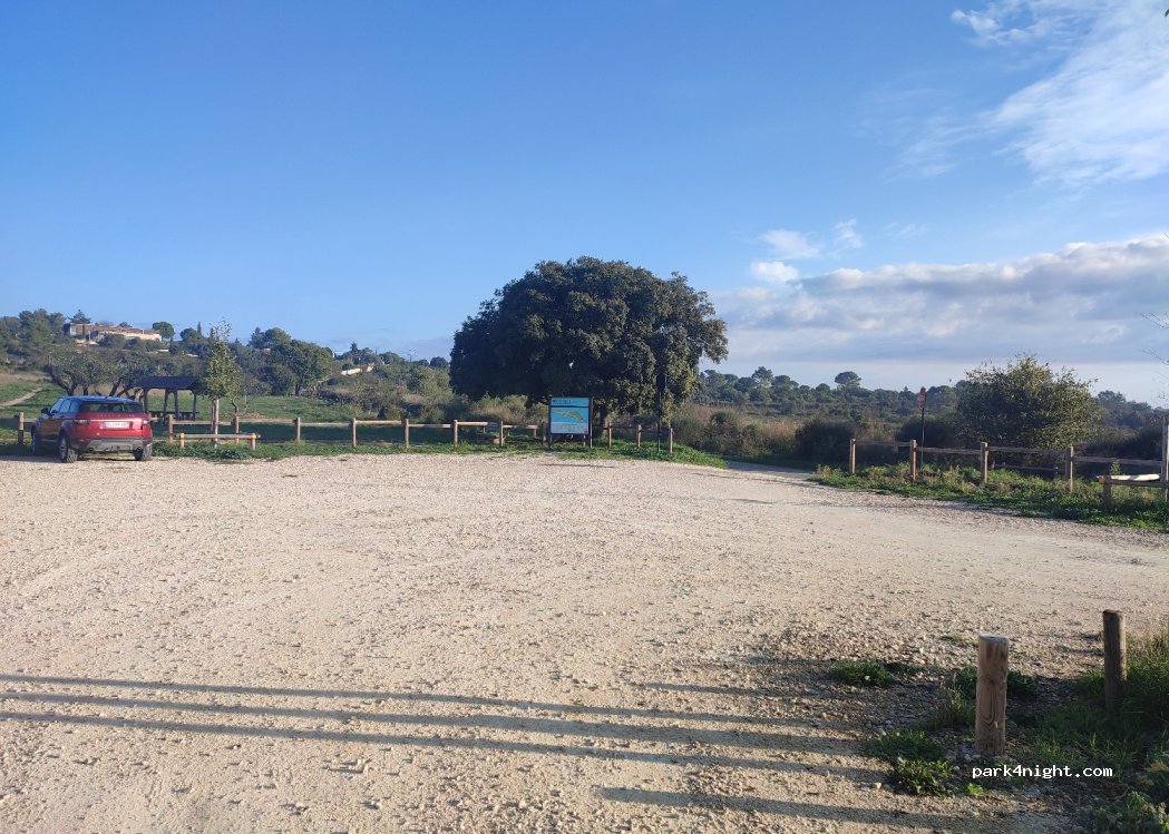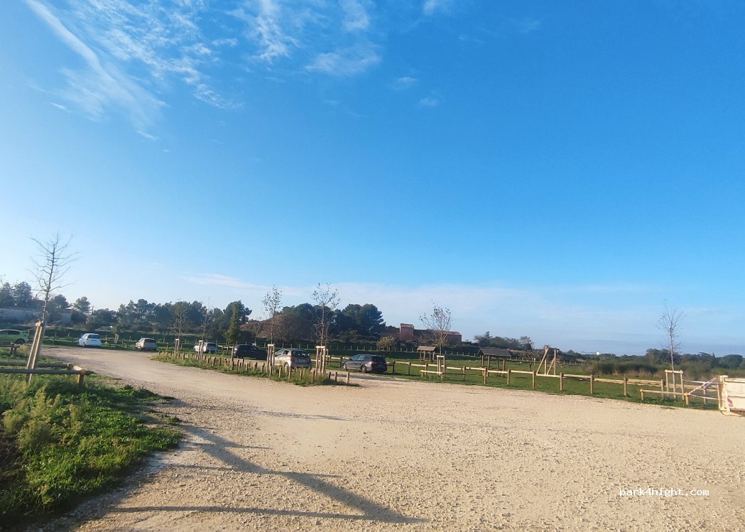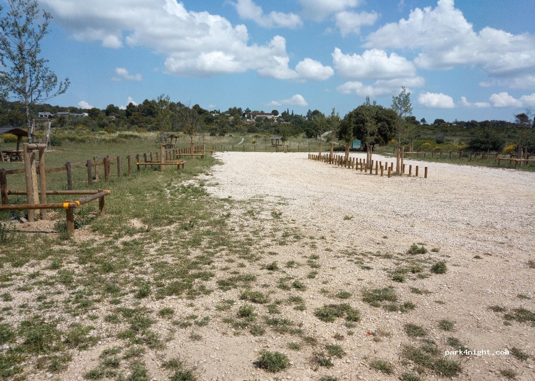 Stationnement gratuit sur un parking de cailloux blanc donnant sur un parc aire de jeux et de pique nique. Nuit très calme. Joggers et vtt à partir de 8h. Joli vue. Fontaine à eau. Attention accès étroit. Les camping cars ne passent pas.