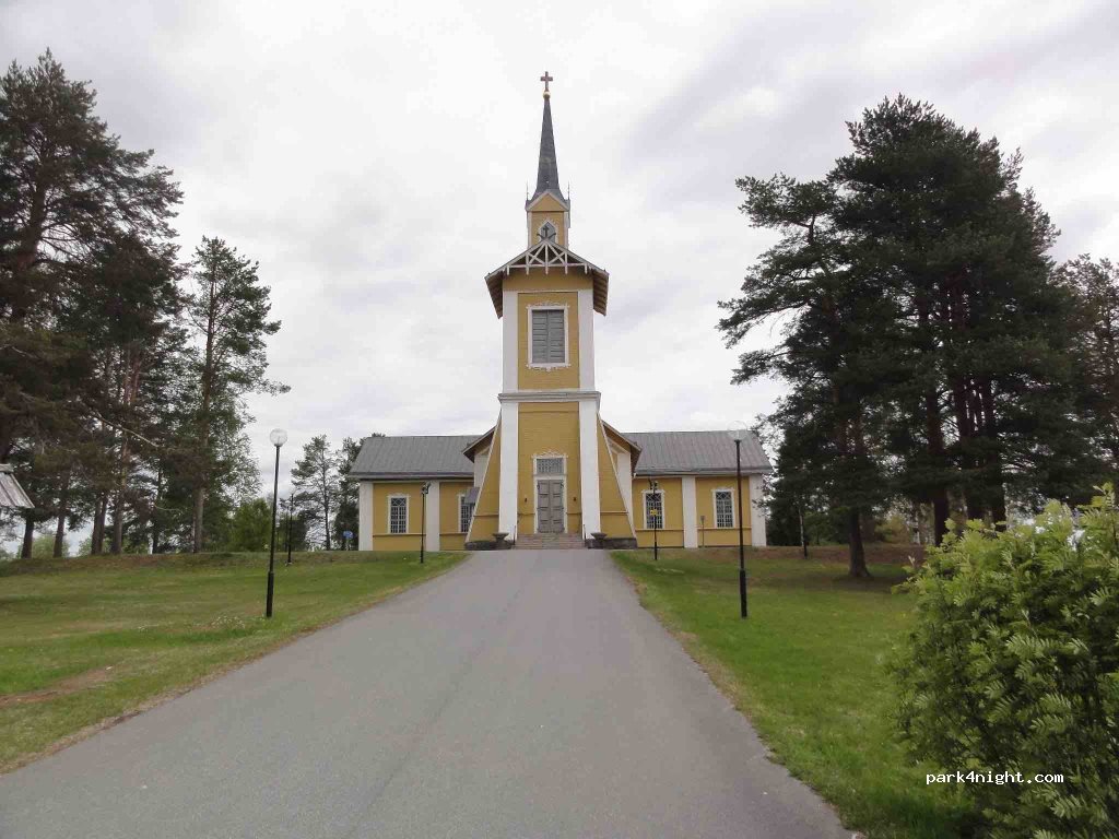 Parken am Pajala-Friedhof. Kein Parkverbot. Allerdings nur für kleinere Fahrzeuge. Sie können die Kirche und die Sonnenuhr von Pajala besichtigen.