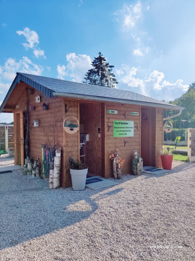 magnifique aire, wc, douche,coin vaisselle d'une propreté irréprochable. tout est bien pensé. bel endroit au calme. accueil fort sympathique du propriétaire qui donne plein d'infos sur endroits à visiter. nous reviendrons avec grand plaisir. Colette et Yves