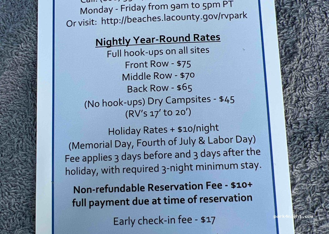 RV Park malheureusement quasi incontournable quand on doit rendre son RV loué chez Cruise America à LA. D’ailleurs 1/3 des RV sont des Cruise America. Une vraie rente pour ce RV Park qui facture 2 nuits minimum à $65 soit $130 pour entendre les avions qui décollent. Pas de réservation possible le jour même. Attention si arrivée tardive il n’y a plus d’accueil et on se retrouve devant la barrière sans solution vu que dans le coin tous les parkings sont interdits la nuit aux RV.