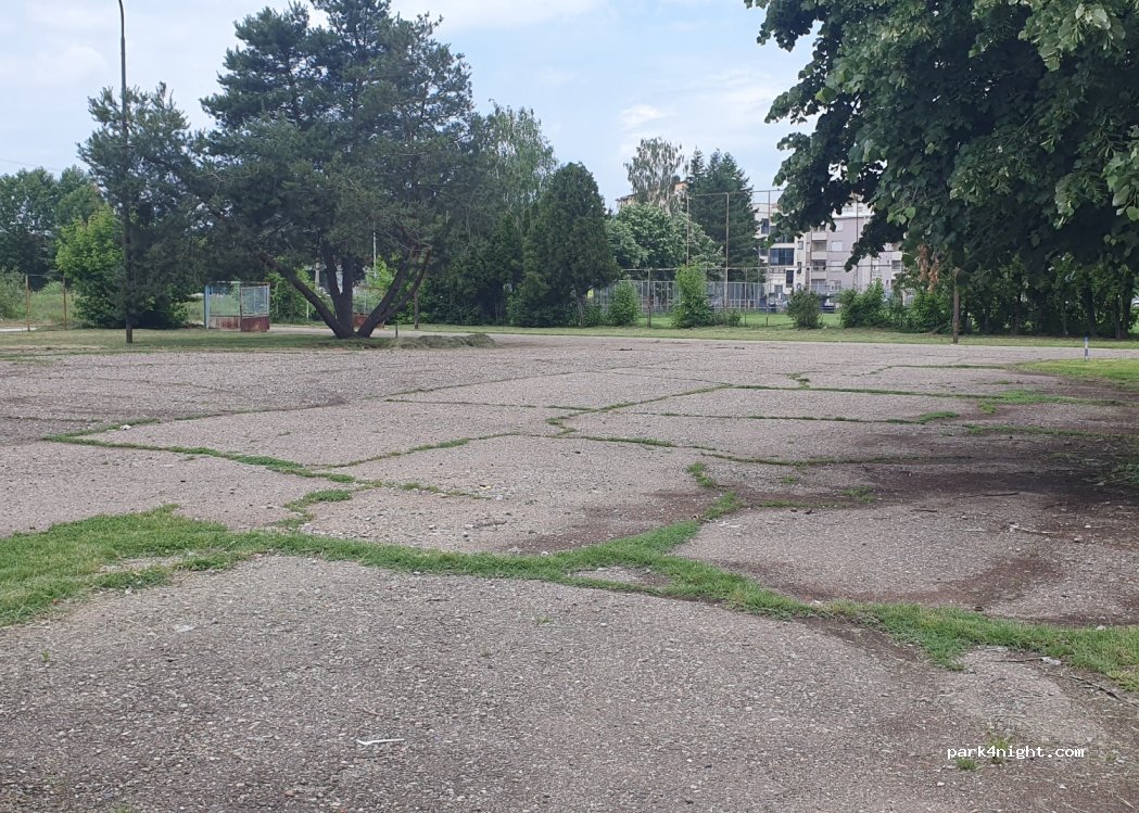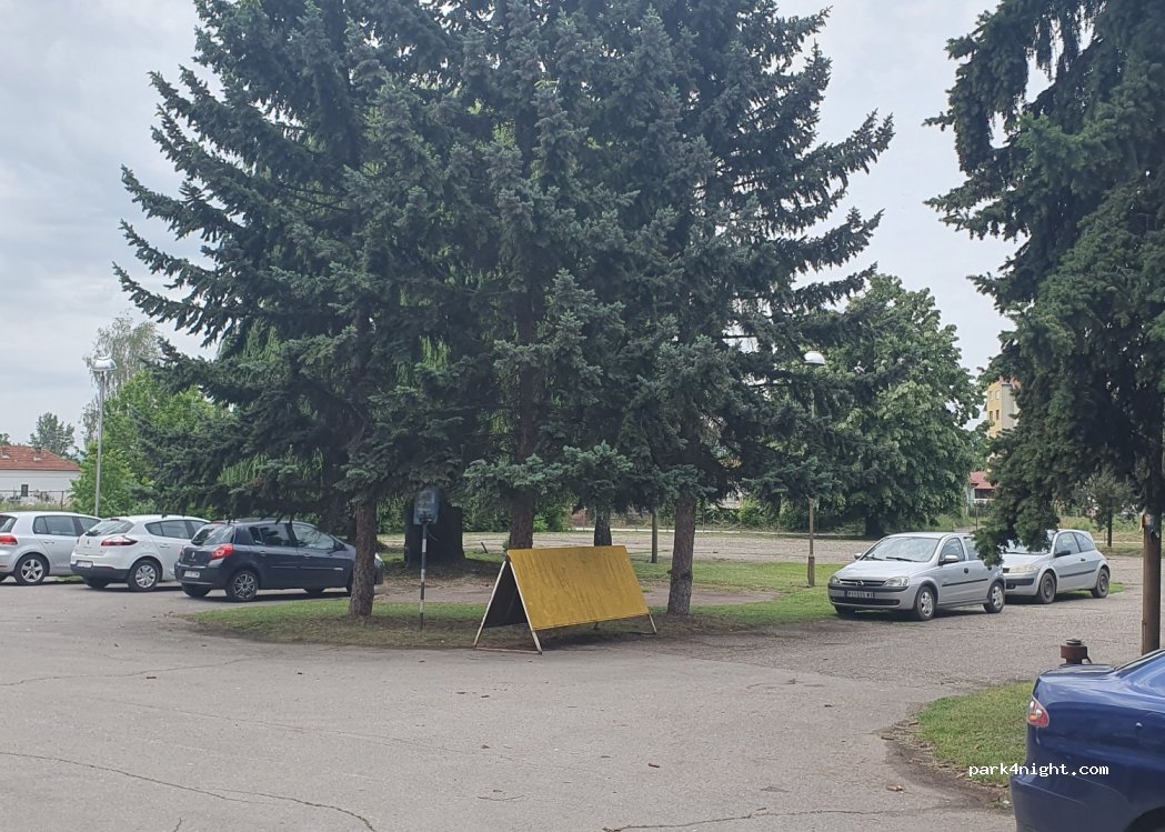 Leveled big parking spot surrounded by various sports areas. There's communal swimming pool just a couple of minutes away, 150 dinars for a person for swimming and saunas! On the street is the garbage bin.