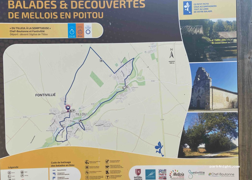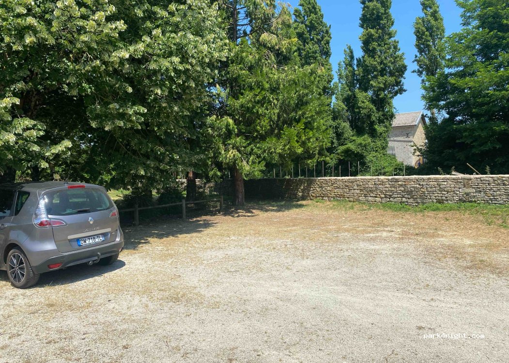Small parking area next to the church and Mairie in the middle of the village. Shaded grass area. Suitable for small camping-cars and motorhomes under 5m. No height restriction. No facilities.