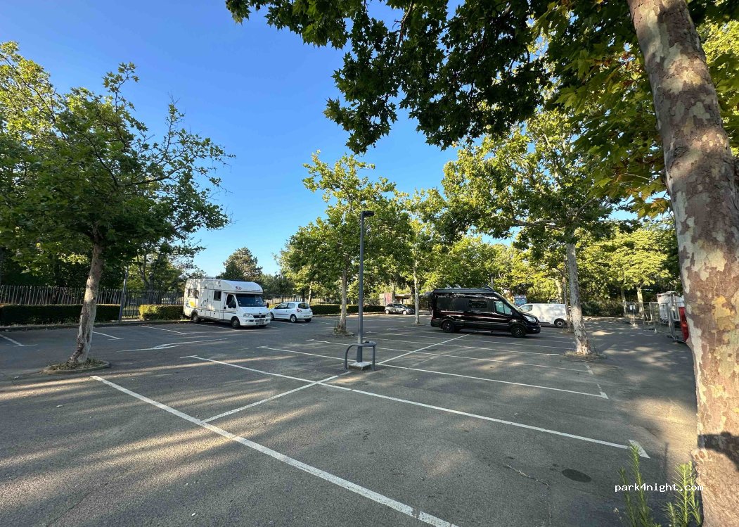 Pretty flat land on the edge of a large suburban Toulouse park, garbage cans, toilets, faucet, tennis court, beautiful greenery for picnics or take out a slack-line, playground for children. Not bad at night, parking spaces in the shade for the heat, or in the sun for your solar panels. Stay discreet to avoid bringing barriers of anti-jumping heights :)