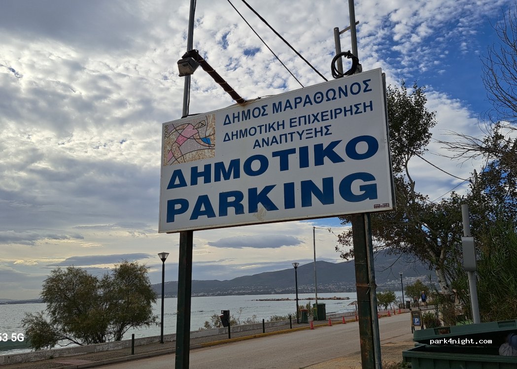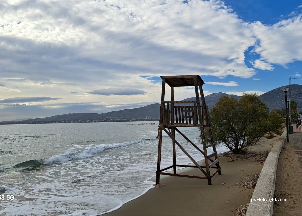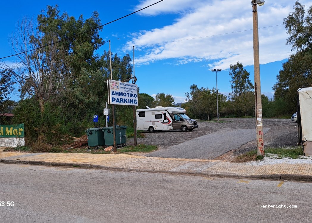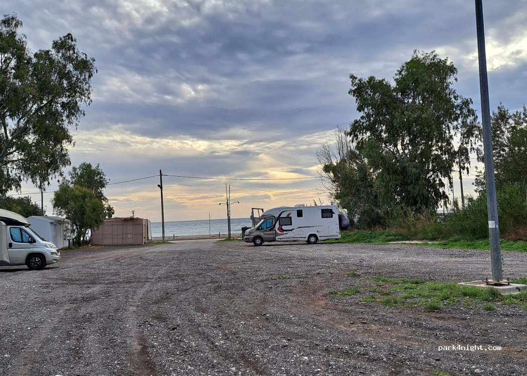 Ample free parking for many motorhomes. There were only two of us when we stayed in November. Close to good quality cafes and tavernas. Minimarket close by walking to right facing sea. Walk to left facing sea, when the road runs out there is beach front walking path, ideal for walking dogs off leads. It was a much quieter resort than we expected, being just 30 minutes from Athens Airport.