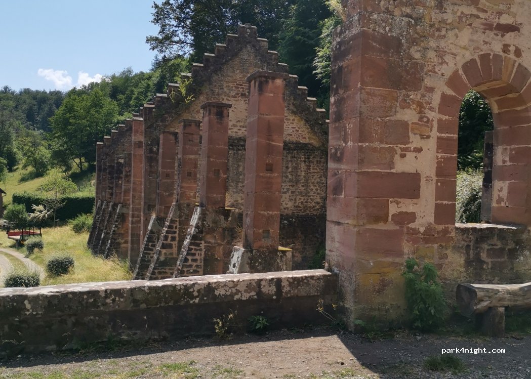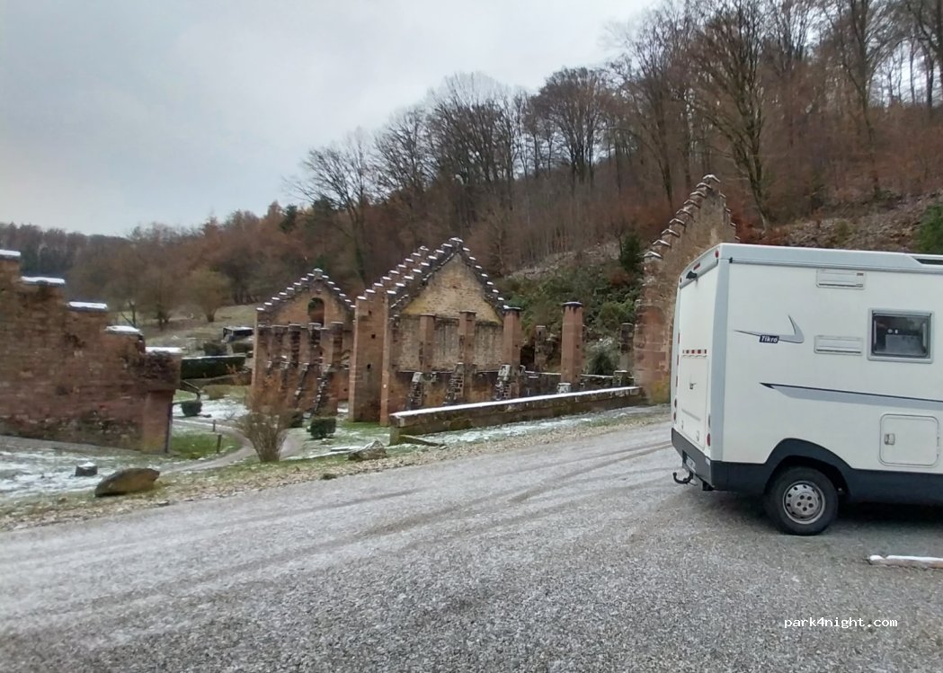 Bel endroit pour une halte pique-nique avec vue sur un ancien barrage et un monument industriel. Places de parking suffisantes disponibles. Lors du stationnement de longs camping-cars, veillez à ce que le chemin menant aux places de stationnement reste dégagé, car il y a une route forestière et de temps en temps des tracteurs forestiers passent.