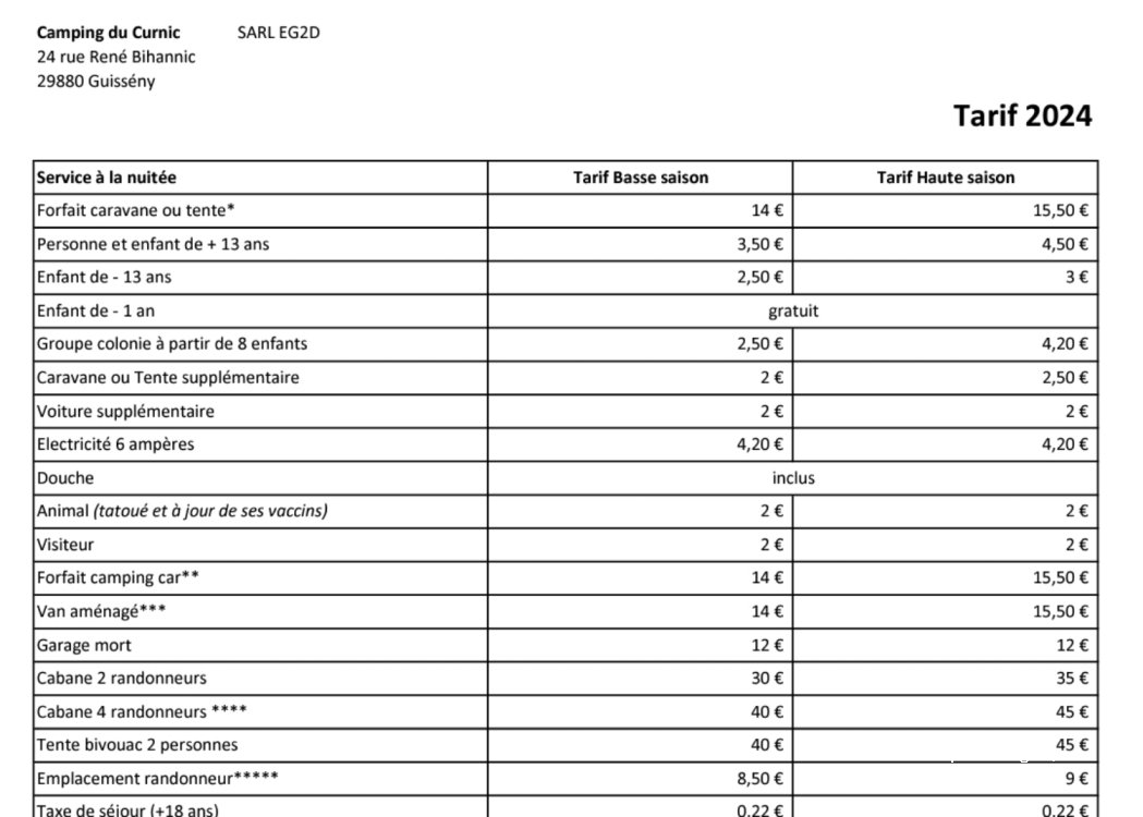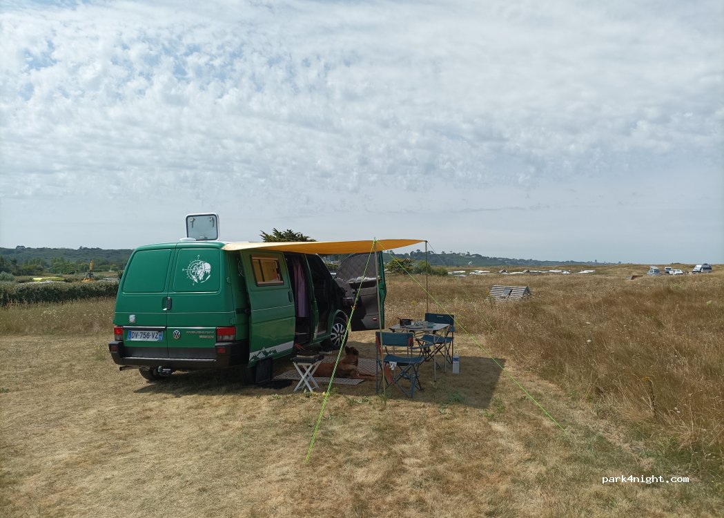 29880 Guisseny, existe una zona para autocaravanas de reciente apertura. 15 parcelas de 100 m2 cada una están integradas en el camping Curnic situado en una zona clasificada Natura 2000, ¡un camping verdaderamente natural! Zona segura 24 horas al día, 7 días a la semana gracias a la presencia de Manu y David, amables responsables del camping. Acceso directo al mar, impresionantes puestas de sol, paseos y caminatas por las dunas. Precios más bajos del sector. Los usuarios de la zona de aparcamiento podrán disfrutar de los servicios del camping (instalaciones sanitarias, ducha, WC, papeleras para la ropa y la vajilla, lavadora y zona de juegos para niños). La zona de acampada dispone de parcelas y alquiler de cabañas totalmente equipadas y tiendas de campaña holandesas. Alimentos disponibles en recepción y pan y bollería en julio/agosto bajo pedido.