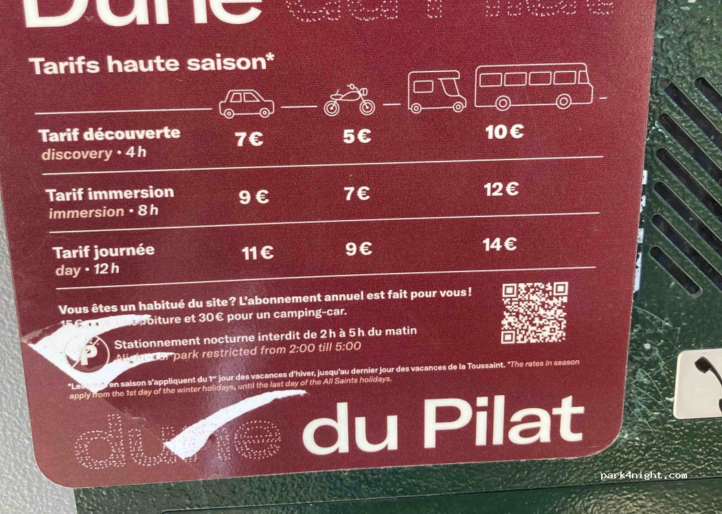 Le tarif est un scandale 10 € la journée pour les camping-cars et si vous restez la nuit vous prenez en supplément 40 € d'amende comme si vous avez perdu votre ticket donc cela vous revient à 50 euros. Pour visiter la dune garez-vous avant ou après l'entrée principale de la dune sur des petits parkings sauvages mais il faut y aller à pied. Je l'ai fait sans avoir de problème.