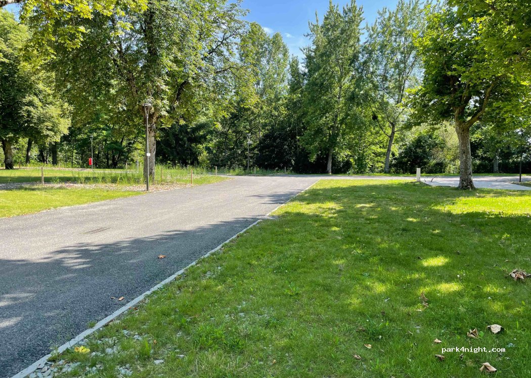 Great stopover. Not very busy in May. Lots of semi shaded spots surrounded by grass, trees and birds but close to shops. Plenty of water taps, clean spacious drainage area. Only negative was a barely warm shower and no soap provided at hand basins. €18.30 for 2. I think electric is included but we would prefer a cheaper option without electric as we don't require it.