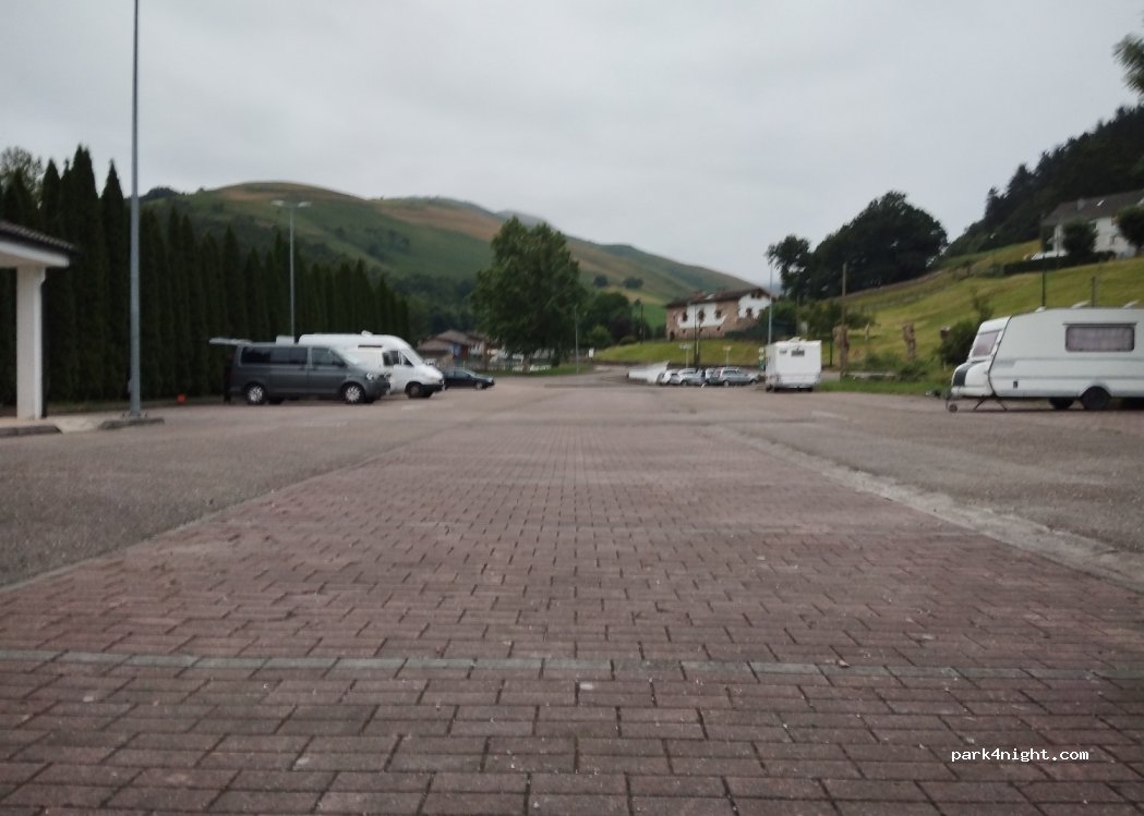 Très grand parking, avec places BUS et voitures, balisé et gratuit à côté d'une école et de la clinique. Il y a un joli parc avec des balançoires. La ville est très proche à 100m. Généralement très calme même à proximité de la route. Déchets et recyclage. Une fontaine dans le parc (Bolera). Piscine ouverte de 12h00 à 20h00 gratuitement et avec douches