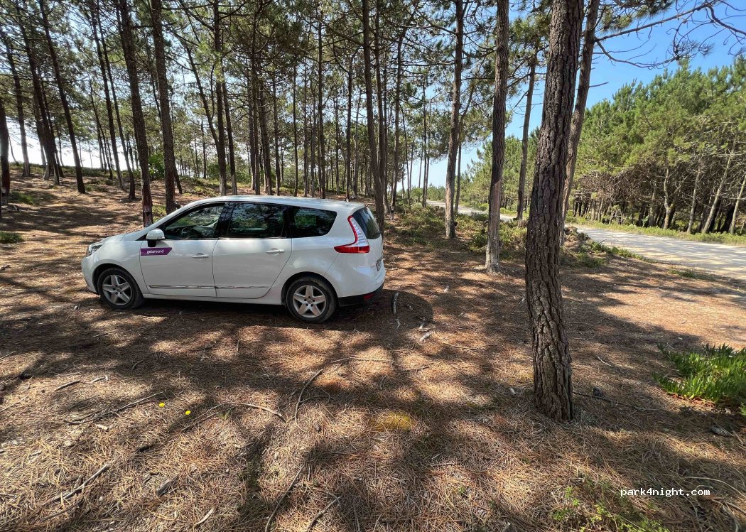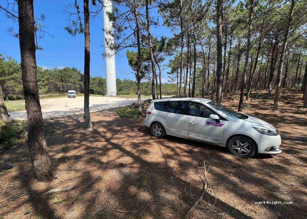 Nice flat place under the pines, close to a wind turbine. For a single car, van, or motorhome. It’s a good alternative to the place under the wind turbine, as this one has more privacy and more shadows. A bit of noise from the wind turbine but nothing too noisy. If this spot is taken you cam always go under the wind turbine just across the road.