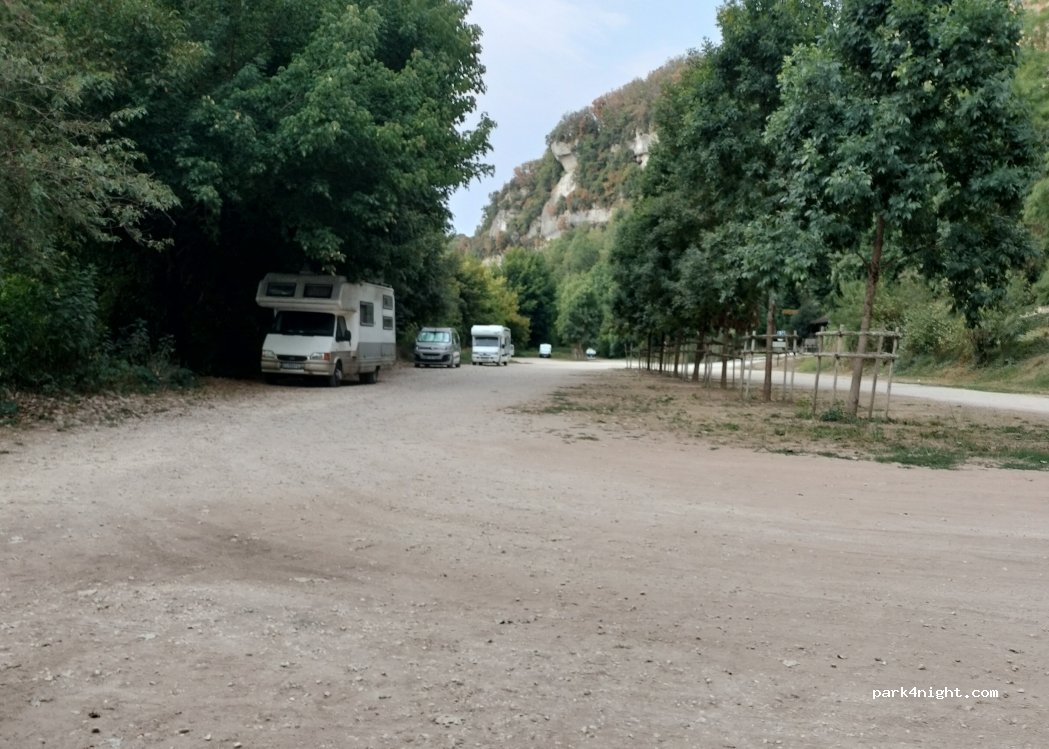 Idéal pour visiter la grotte. Plat et spacieux. Bordure de route mais très calme.