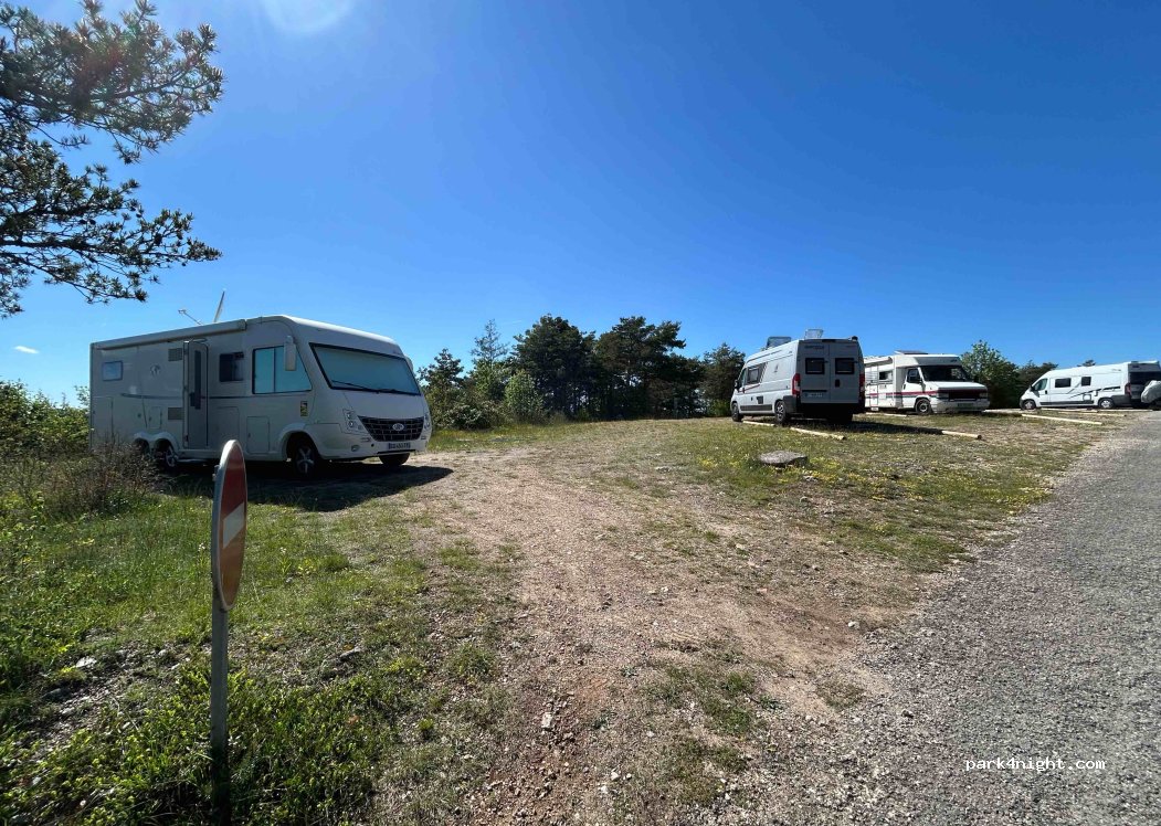 Entrée au site payante : 7 €/adulte. Parking camping-car sur herbe. Nuit autorisée, très calme, sans service. Belle vue. Pour les randonnées​ dans le parc, se munir de bonnes chaussures car les chemins "bleu, rouge, jaune" sont parfois escarpés.