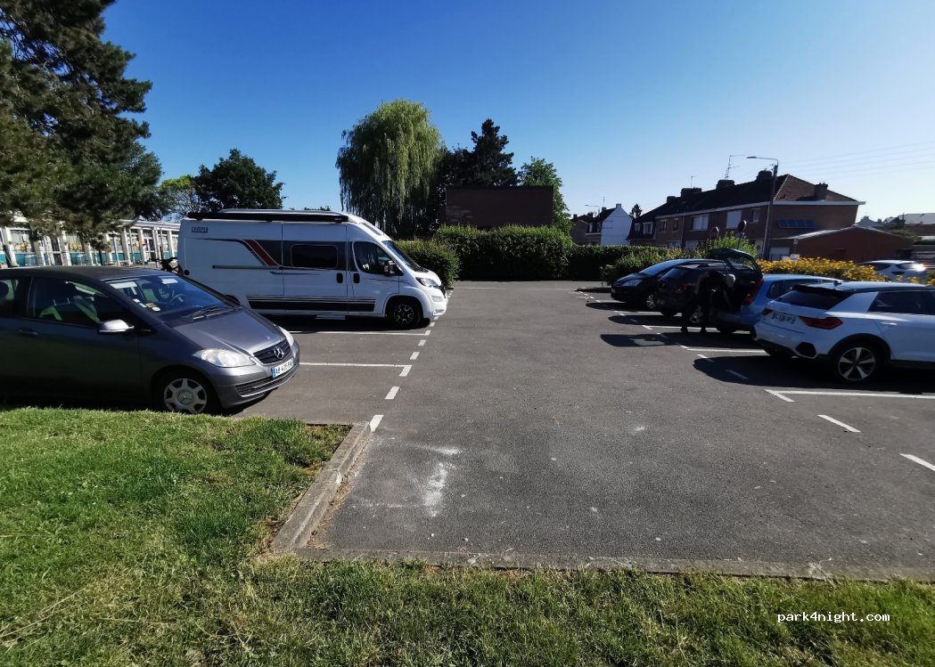Parking d'une école sans panneaux d'interdictions mais il est évident qu'en période scolaire, il est à éviter. Calme, 11 places voiture mais notre CC de 6m20 (av porte vélo) tenait très bien. Quelques passages de voiture mais rien de méchant.