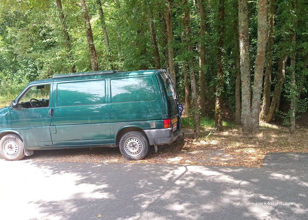 Dépanne pour un pique nique/ sieste/ ou nuit. Petit renforcement au bord d’un chemin que forêt. A l’ombre peut loger deux vans. Table de pique au long du chemin, les voisins sont aimable. Au bord de route mais les voitures roule doucement car entre deux lotissements.