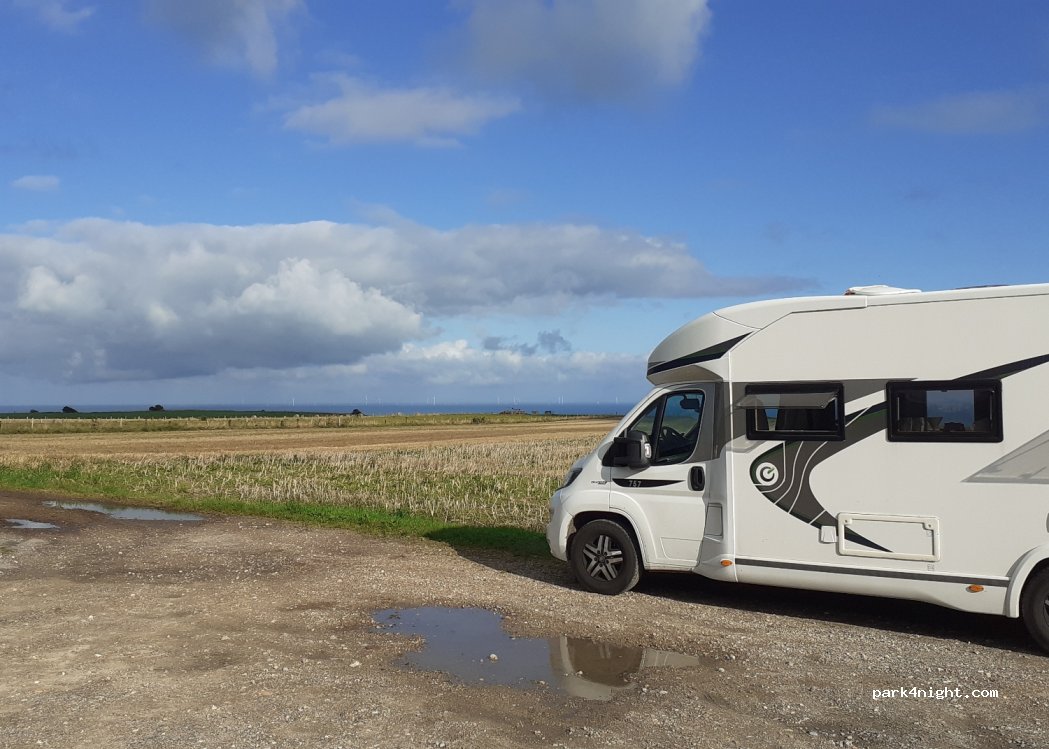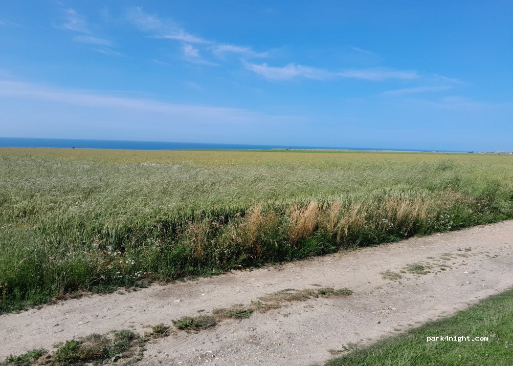 Ruhige Nacht, ebener Stellplatz. Aussicht auf das Meer und die Felder. Tisch und Bänke vorhanden.