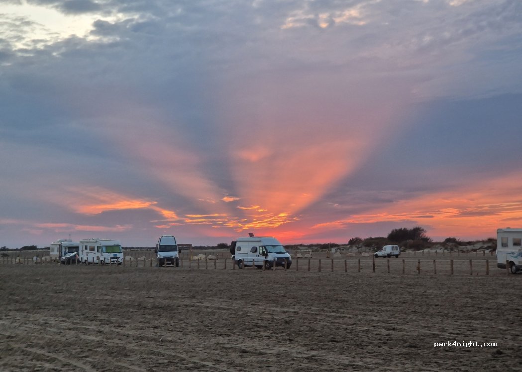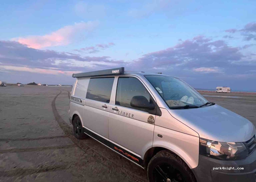 Stationnement sur la plage, beaucoup de van et de camping car ce soir la. Nuit au calme, réveillez à 4 heure du matin par la pluie je suis parti j ai eu peur de rester embourbé.je recommande vivement, juste faire attention ou on roule et où on se gare, le sable ´ est pas très dense par endroit.