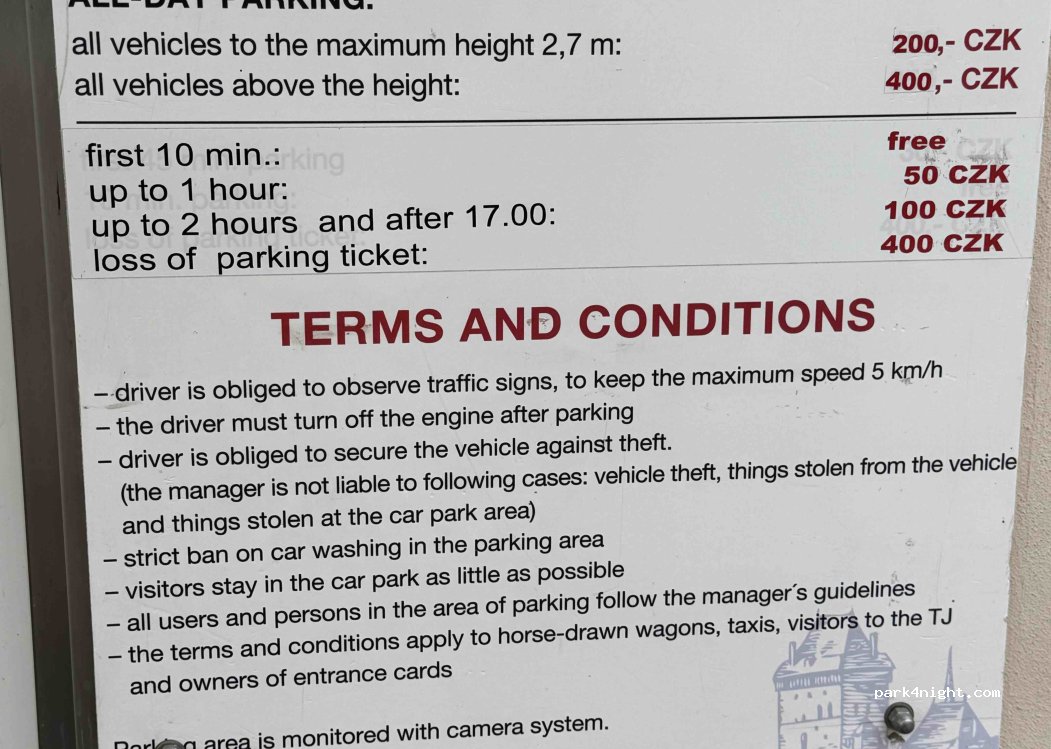 Convenient parking to visit the castle in the morning before the foule.nous arrived at 18h 30 to 13h, divided we paid 50 czk with a van under near railroad 2,70m.voie night but quiet nonetheless.