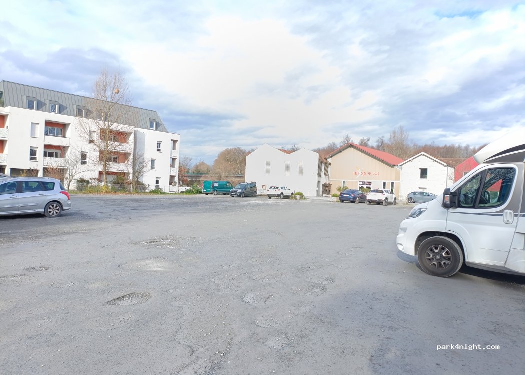 Buen lugar para visitar Pau y quedarse a dormir, ya que es muy tranquilo por la noche. Es un aparcamiento plano gratuito no asfaltado ( piedras ), con conexión al centro por un carril bici. Hay un gimnasio al lado y el aparcamiento se llena sobre todo por la tarde, pero a partir de las 21:00 h se vacía.