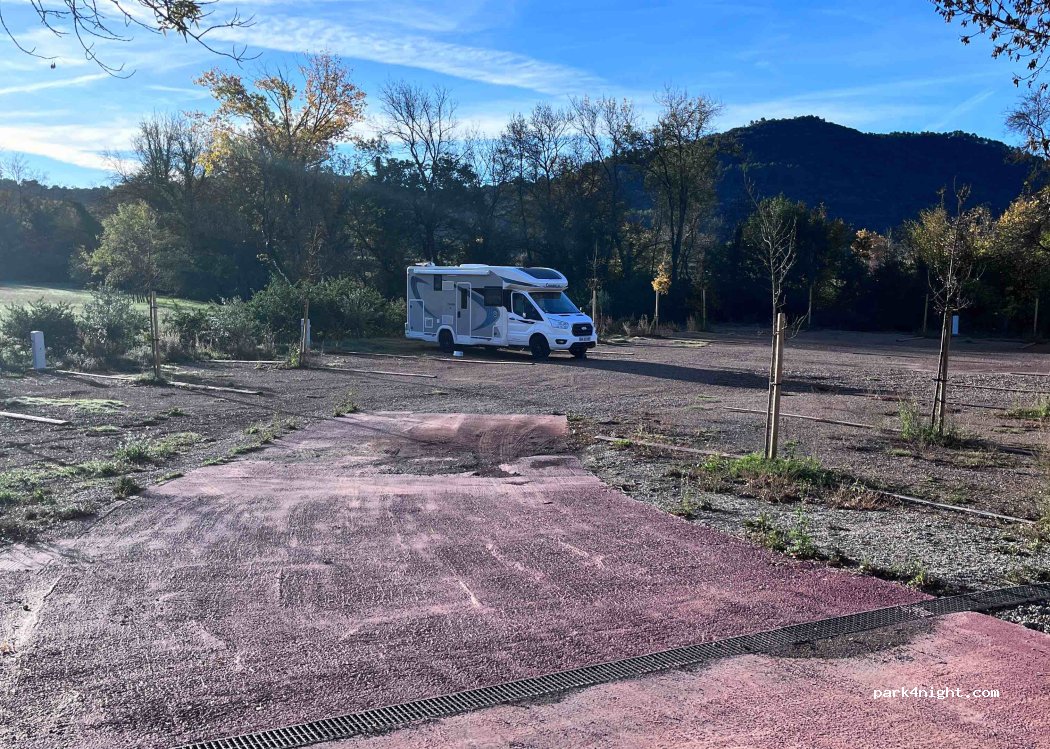 petite aire de camping-car de 30 places idéale pour passer la nuit, 15€ avec l'électricité, terrain en cailloux, vidange K7, eau en sus. attention très mal indiquée a ne pas confondre avec le terrain de camping qui se trouve côte à côte.