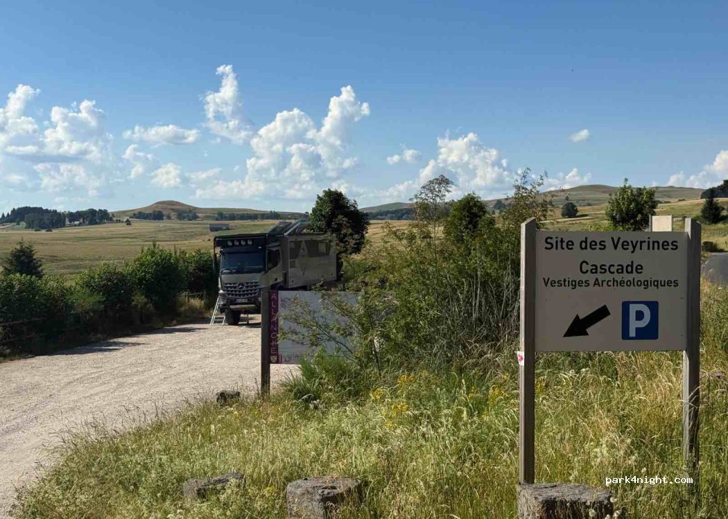 Parkplatz Cascades de Veyrines. Kiesboden, leichte Verkeilung zu erwarten. Ort umgeben von Natur mit einem schönen Wasserfall. 2 Minuten zu Fuß. Verkehrsarme Straße in der Nähe. Kein Service.