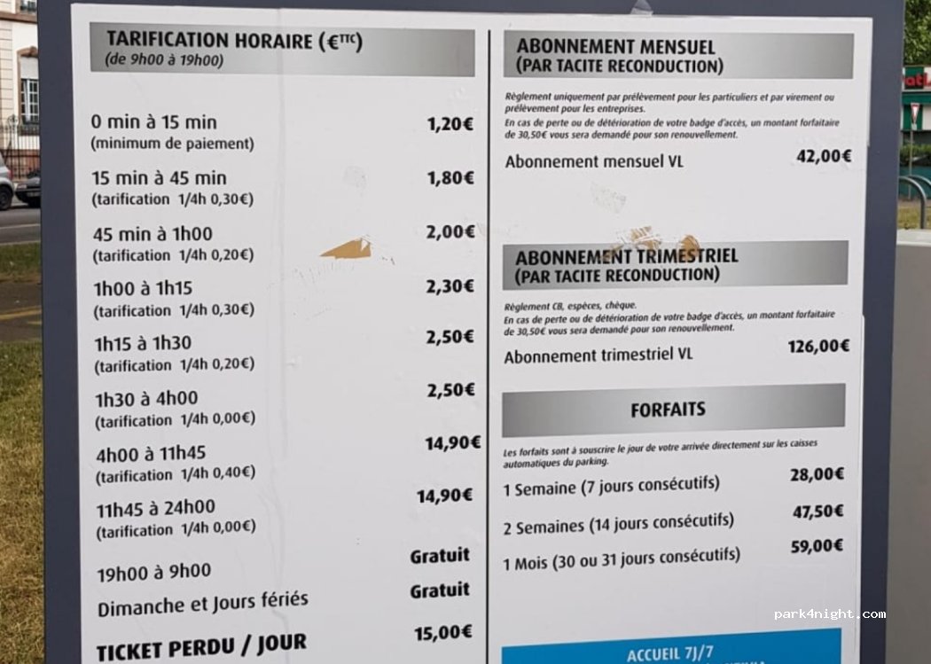 Porte Haute city parking lot is very central, just steps from Mulhouse's historic center. Easy access and exit. The parking lot is flat, with plenty of spaces, even for long vehicles, some with some shade. There are no specific camper services, but all the downtown shops are nearby, including a laundromat. Payment is based on time slots (see attached photo).