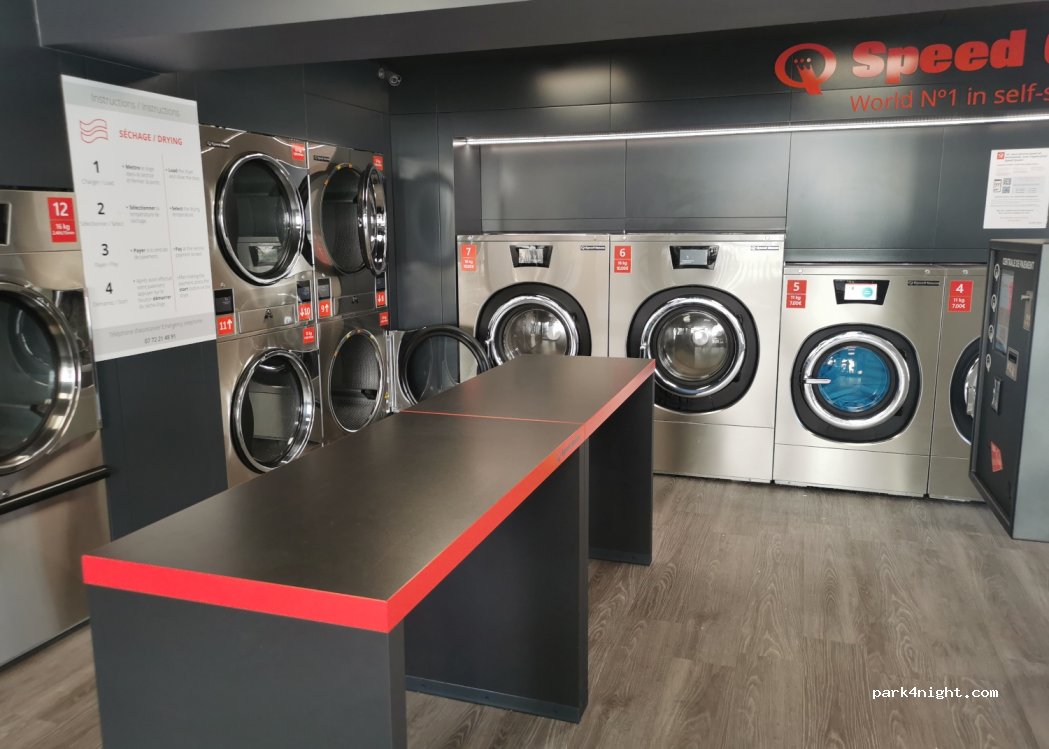 Laverie Speed Queen, ouverte de 7h à 21h, bien entretenue, facile d'accès et de compréhension des horaires. Panneau de contrôle centralisé, multilingue, accepte les euros de toutes les coupures et les cartes de crédit. Plusieurs machines à laver jusqu'à un maximum de 18 kg, vous choisissez le type de séchage, éventuellement en augmentant de 10") supplémentaires).