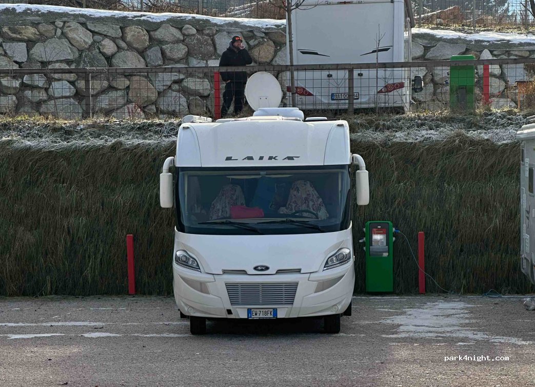 Si tratta di un’area di sosta con tutti i comfort del campeggio: docce, bagni (degni di un hotel a 5 stelle) ed energia elettrica sono compresi nel prezzo. Ampie piazzole su 3 livelli ognuno dei quali dotato di rubinetto acqua per un carico veloce senza spostarsi molto dalla propria piazzola. Unico neo lo scarico delle acque nere non è riscaldato, tutto ghiacciato e non utilizzabile.