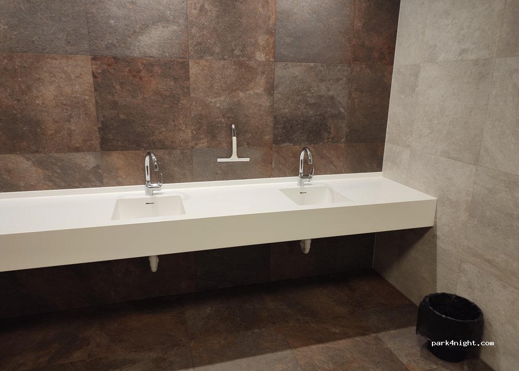 Alles nagelneu, sauber gepflegt und voll automatisiert. Auf das wesentliche reduziert, man bringt also in die Sanitäranlagen seine Seife und sein Handtuch mit. In der Behindertentoilette gibt es zur Zeit noch kein Toilettenpapier, das sollte nachgebessert werden. Wer es gern besonders ruhig hat, achtet auf den Verlauf der Bahnlinie. Uns hat es gut gefallen