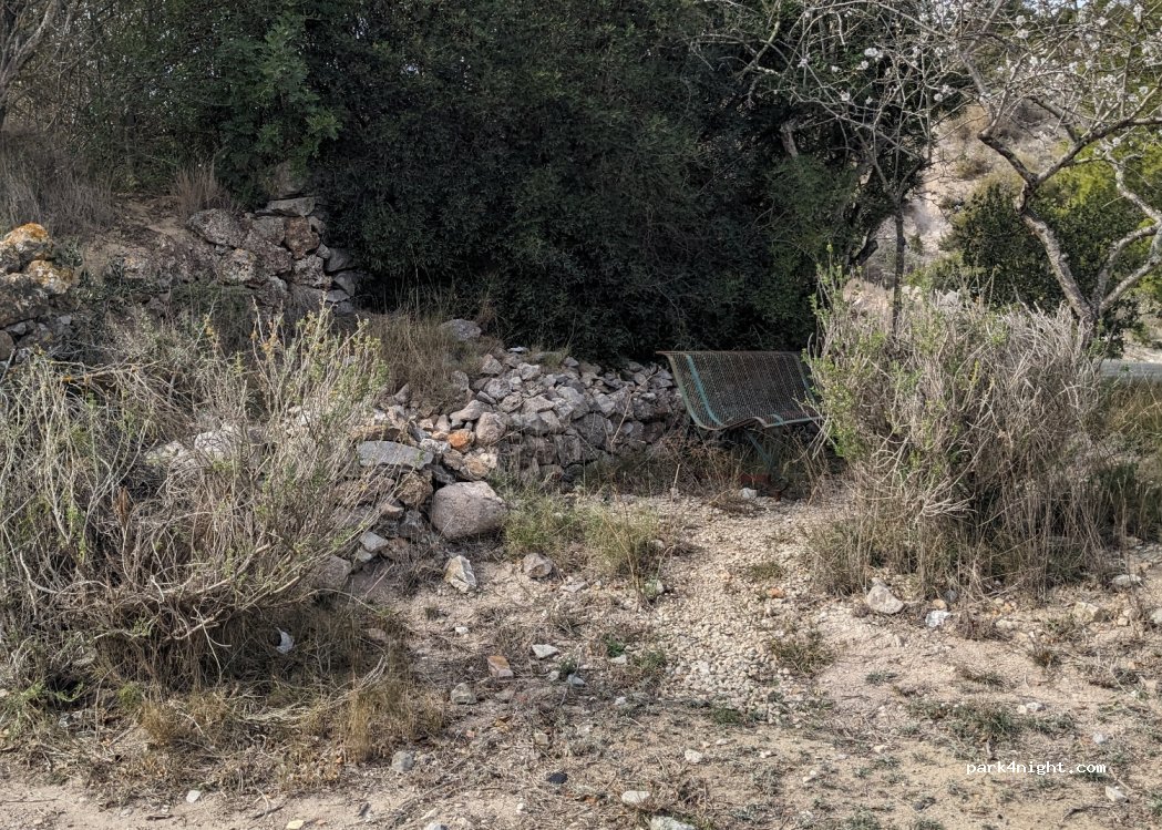 Versteckter Ort mitten in der Natur mit einer Steinmauer, die den Wind schützt. In der Nähe von Fitou. Nachts können Sie das beleuchtete Schloss der Stadt sehen. Einige Standorte mit etwas Gefälle. Sehr wenig befahrene, aber nahe gelegene Straße.
