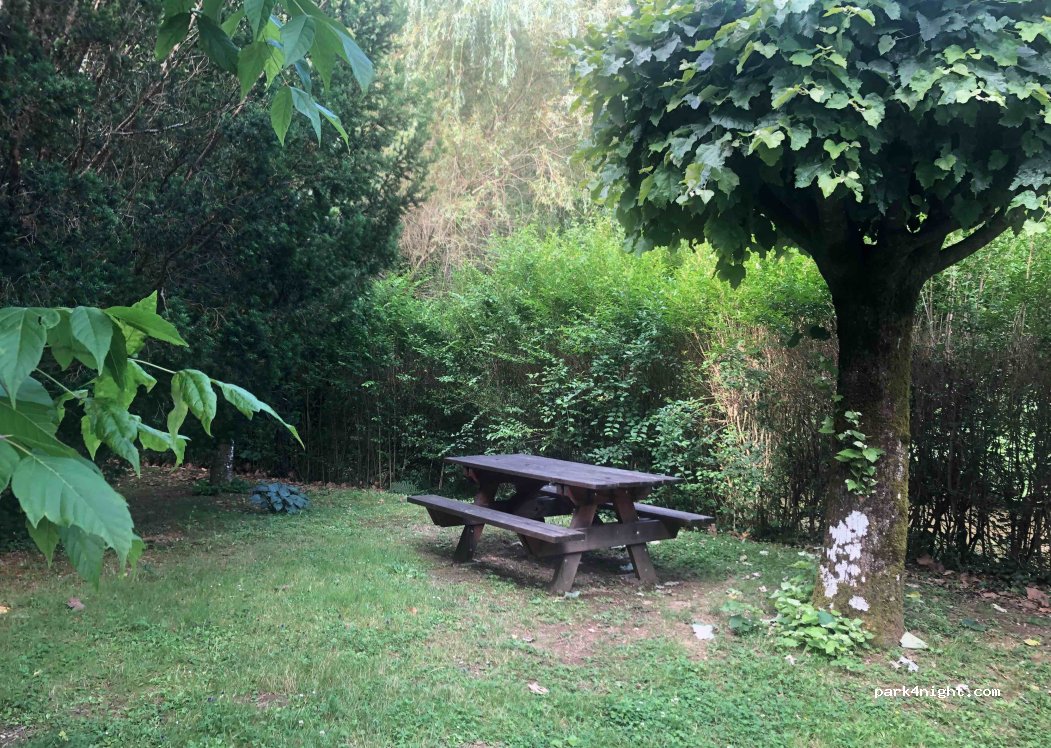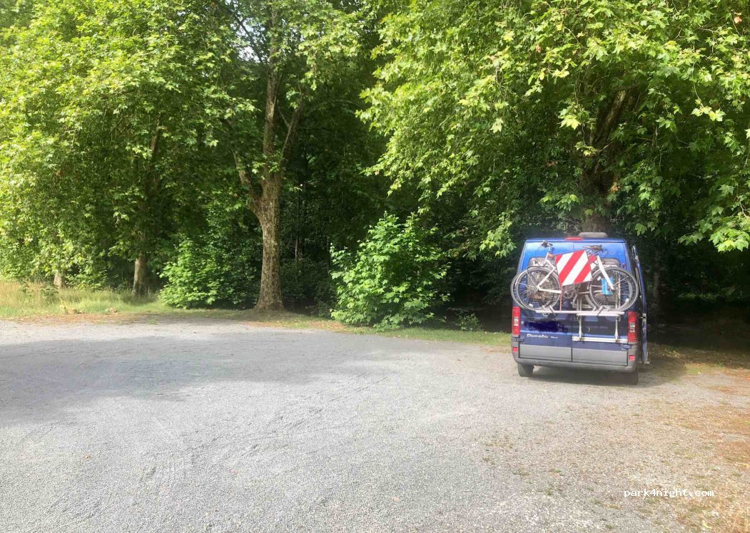 Nice picnic area just before Rochechouard by the creek after an old bridge. At least 10 picnic tables, also in the shade, along the small dammed creek. No overnight ban. Space for about 3 mobile homes plus additional cars. No demarcated parking areas, so no length restrictions.