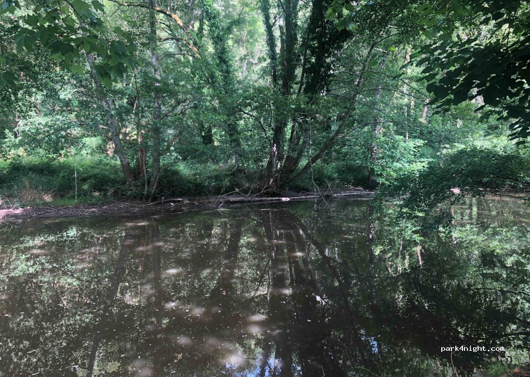 Schöner Picknickbereich kurz vor Rochechouard am Bach nach einer alten Brücke. Mindestens 10 Picknicktische, auch im Schatten, längs des kleinen gestauten Baches. Kein Übernachtungsverbot. Platz für ca 3 Wohnmobile plus zusätzlich PKW. Keine Parkflächen abgegrenzt, also auch keine Beschränkungen hinsichtlich Länge.